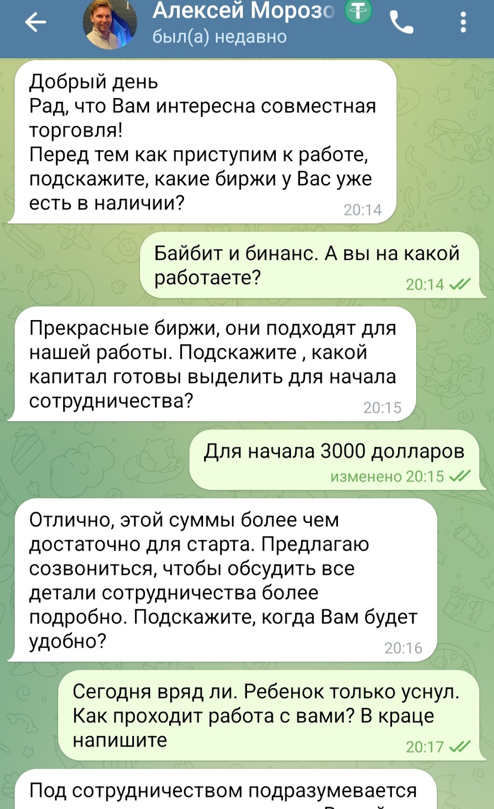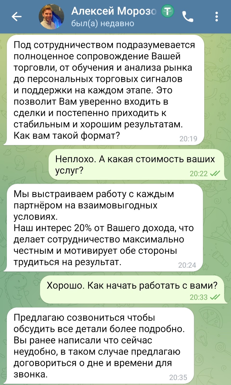 Для начала сотрудничества с ним надо выбрать свой уровень (новичок, опытный или pro-трейдер) и отправить личное сообщение. Отвечает Морозов быстро. Выясняет, на каких биржах подписчик пробовал торговать. Предлагает полное сопровождение сделок. С дохода клиента берет себе 20%.