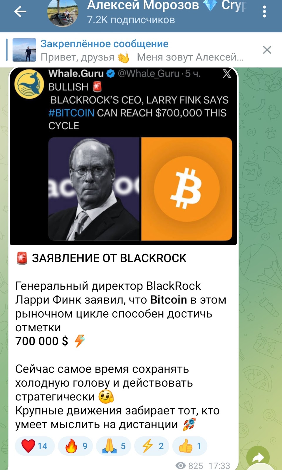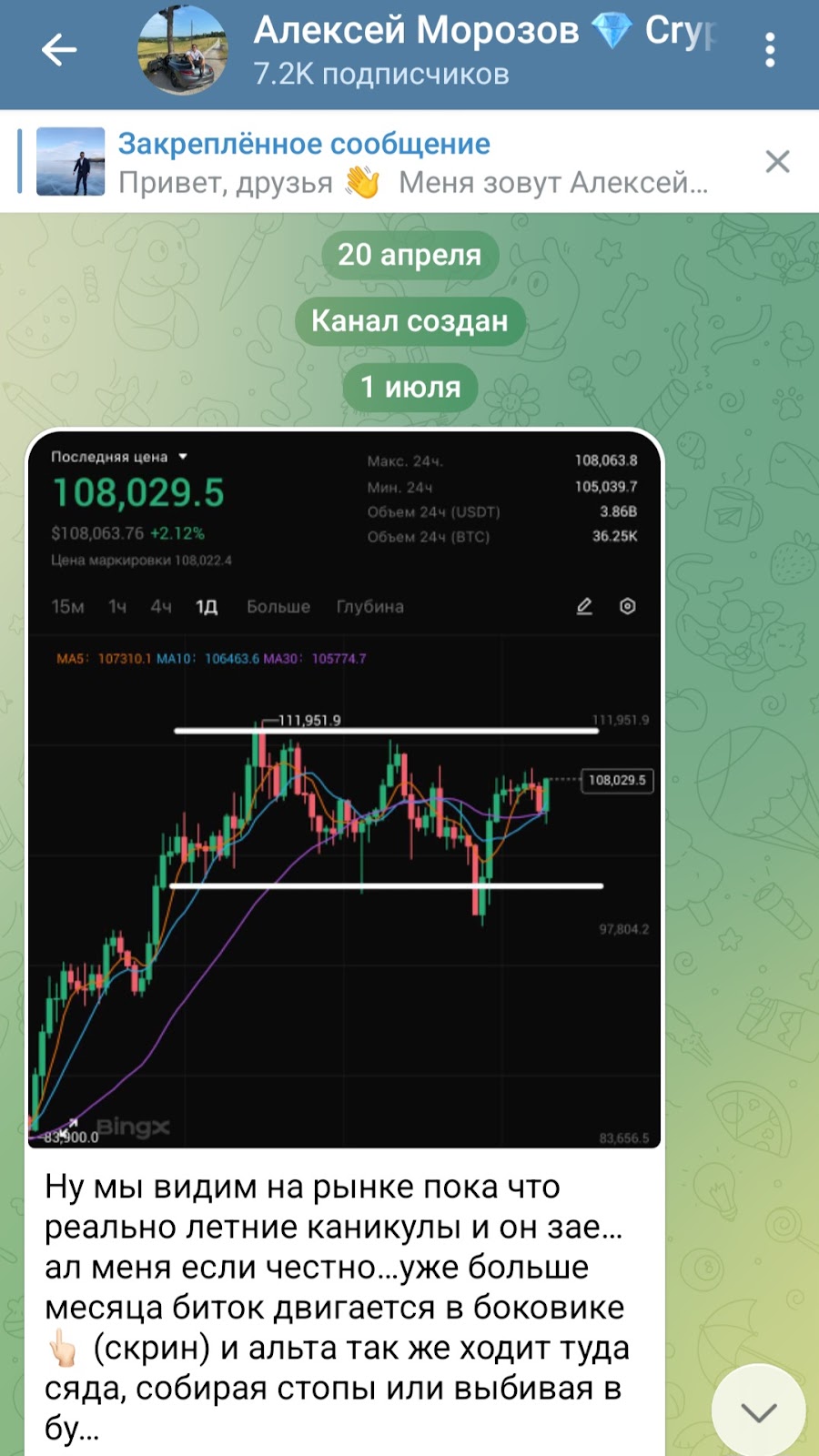 Помимо отчетов по торговле Алексей выкладывает рекомендации для подписчиков, аналитику и новости из области криптовалюты.