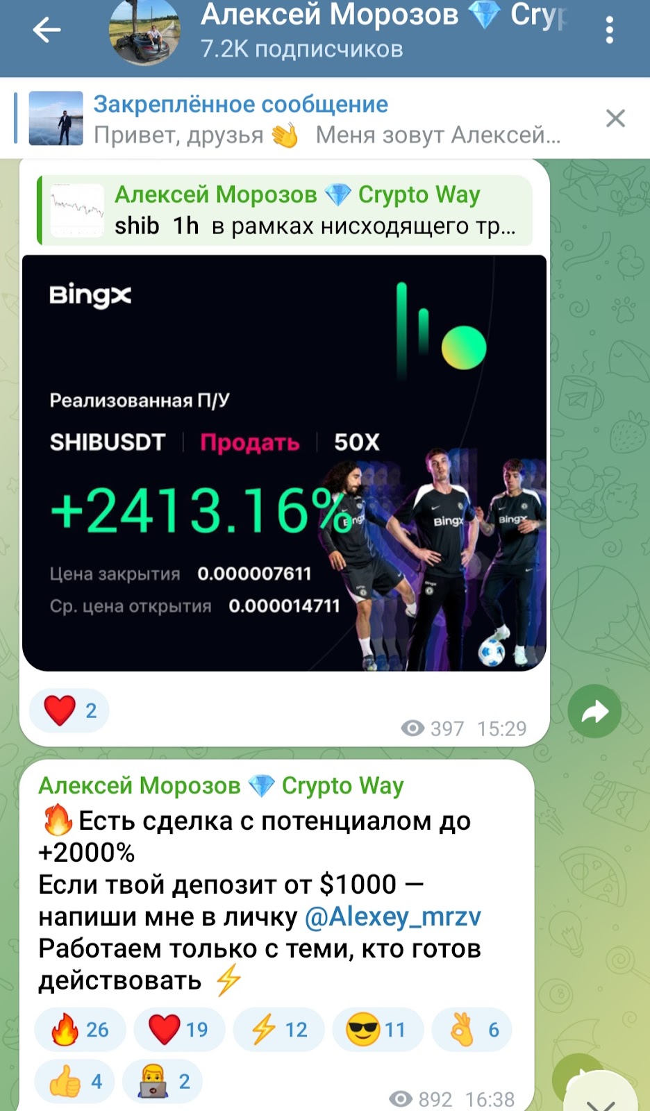 Канал в Telegram “ Крипто Вей” Алексей Морозов ведет с 20 апреля 2025 года. В нем выкладывает результаты своих сделок. Судя по фотоотчетам, работает он на бирже BingX. Увеличивает депозит на 25-2413%. В ленте не было замечено ни одного поста с минусовой сделкой. Иногда встречаются нулевые результаты торговли. Этим трейдер хочет показать отсутствие рисков сотрудничества с ним. Но даже профессионалы иногда уходят в минус, так как рынок криптовалюты очень нестабилен и точно предсказать динамику цен удается не всегда.