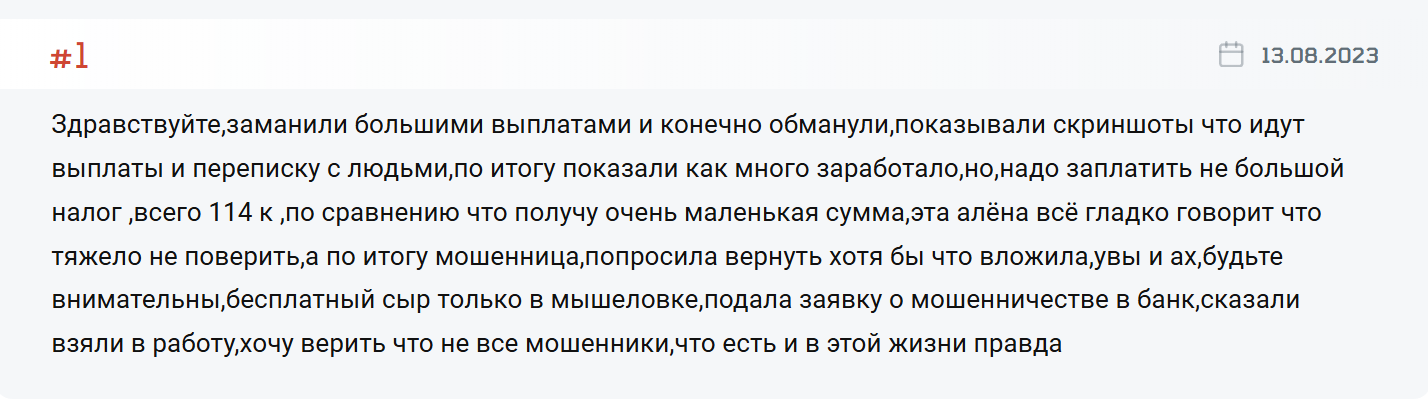 Рассматриваемый канал поработал недолго, поэтому и отзывов об AlenaAiena практически нет. В тех же комментариях, что появляются, пользователи отмечают мошенническую сущность платформы и предупреждают других клиентов о потенциальных рисках.