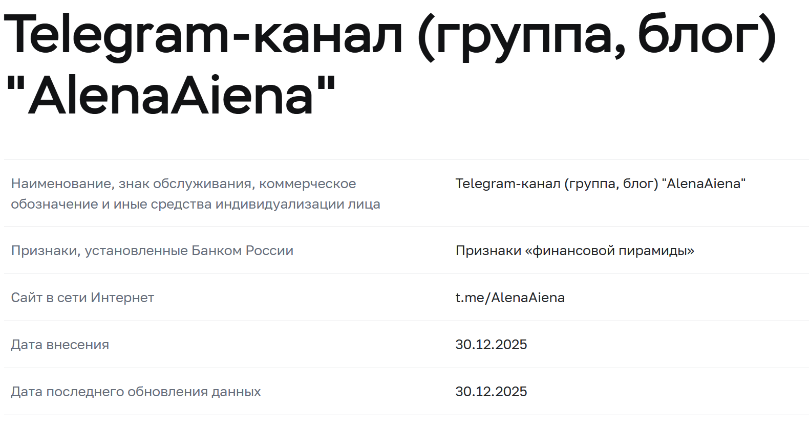 Детальная проверка AlenaAiena показала, что профиль героини обзора в Телеграм находится в черном списке Центробанка России. Здесь сказано, что платформа имеет все признаки финансовой пирамиды. Это означает, что сотрудничество с подобными площадками часто ведет к финансовым потерям.