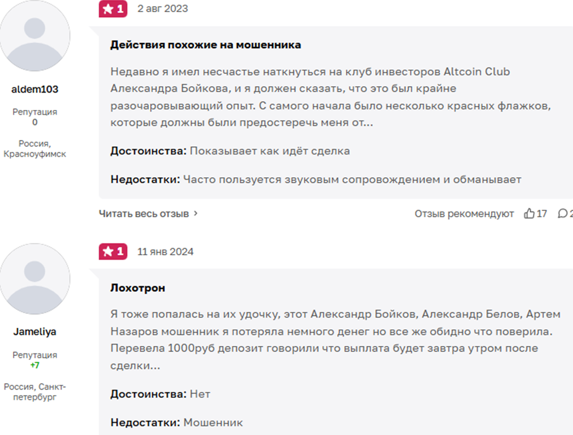 Позитивных отзывов на «Работа с алексом торговый клуб» и другие проекты Бойкова нет.