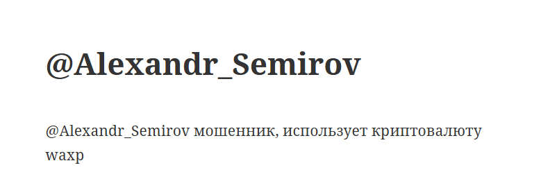 Alexandr Semirov отзывы от людей практически не получил, однако одно упоминание в интернете – да, но об этом в немного позже. Известно, что автор занимается инвестированием в криптовалюту Waxp. Далее информации о трейдере крайне мало.