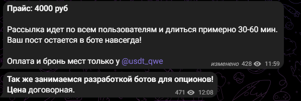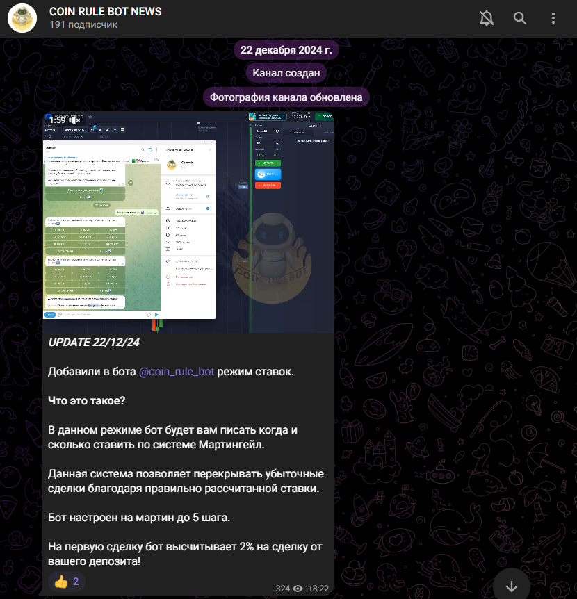 Публичный канал торгового бота для бинарных опционов был зарегистрирован 22 декабря 2024 года. В первом посте сообщается, что бот будет писать, когда и сколько ставить по системе «Мартингейл» – она якобы позволяет перекрывать убыточные сделки. На первую сделку бот высчитывает 2% от первоначального депозита.На октябрь 2025 года на телеграмм-канал подписано 190 человек, но охваты втрое превышают этот показатель. Комментарии под постами закрыты, то есть пользователи не имеют возможности обсуждать новости и делиться опытом друг с другом.