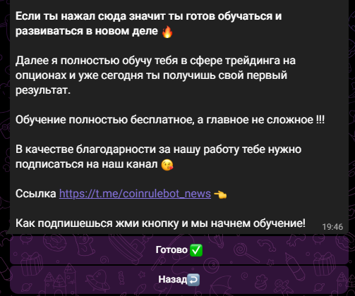 Торговый бот для бинарных опционов активен на октябрь 2025 года и предлагает готовые торговые сигналы. При клике на кнопку «Начать торговлю» AlgorithmicTrade Bot перенаправляет на другого бота @Coin_Rule_bot. Программа обещает обучить новичка торговле опционами и гарантирует результат уже в день регистрации. Утверждается, что обучение полностью бесплатное, а главное – не сложное. В качестве благодарности программа просит подписаться на телеграмм-канал проекта.
