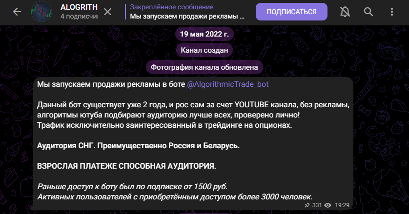 Официальный телеграмм-канал проекта Algorithmic Media был зарегистрирован в мае 2022 года. Администратор в первом же посте сообщил о запуске продажи рекламы в торговом боте для бинарных опционов. Заявлено, что данный бот существует уже два года, и становился популярнее благодаря каналу на Ютуб. Целевая аудитория проекта – преимущественно Россия и Беларусь.