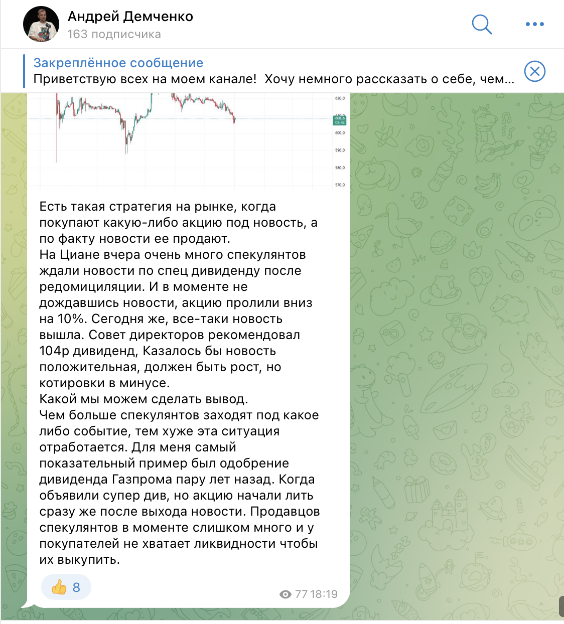 Итак, это реальный трейдер с многолетним опытом и публичной репутацией. Она в основном связана с работой Андрея в школе «А-Лаб». Таким образом, канал нашего героя, по всей видимости, является частью его рекламы по привлечению клиентов для обучения трейдингу. Однако при принятии решения о доверии торговым сигналам из его Telegram-канала стоит всегда проводить собственный анализ.