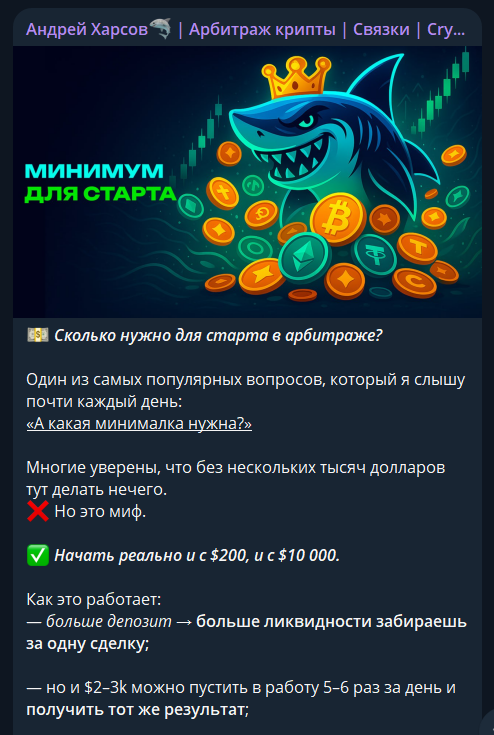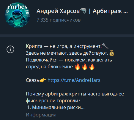 Первый пост на канале Андрея Харсова вышел в феврале 2025 года, хотя создали его еще в 2021 году. Трейдер толком ничего о себе не рассказал, а поначалу только публиковал англоязычные новости криптовалютного рынка. Только в мае 2025-го он начал писать об арбитраже.