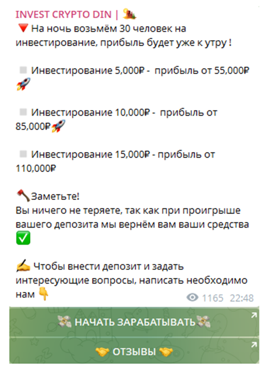 Дополнительно Андрей Морозов, проверяемый на мошенника, предлагает подписчикам приглашать других клиентов к сотрудничеству. За участие в схеме, напоминающей пирамиду, он обещает платить 30% от своей прибыли. Деньги клиентов якобы страхуются Центробанком, но в реестре регулятора Андрей и его инвестиционный проект не упоминаются. В бесплатном формате пользователи получают только доступ к сообществу специалиста.Обзор канала Invest Crypto Din и других соцсетей трейдера