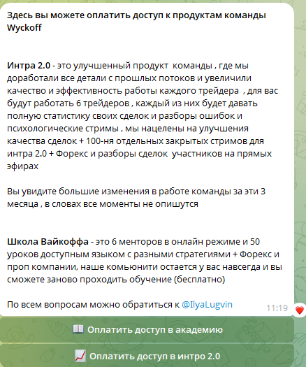 Основная платная услуга – доступ в закрытый чат Интра. Это закрытый продукт команды Wyckoff, позиционируемый как «улучшенный формат» предыдущих потоков. Заявлены:
