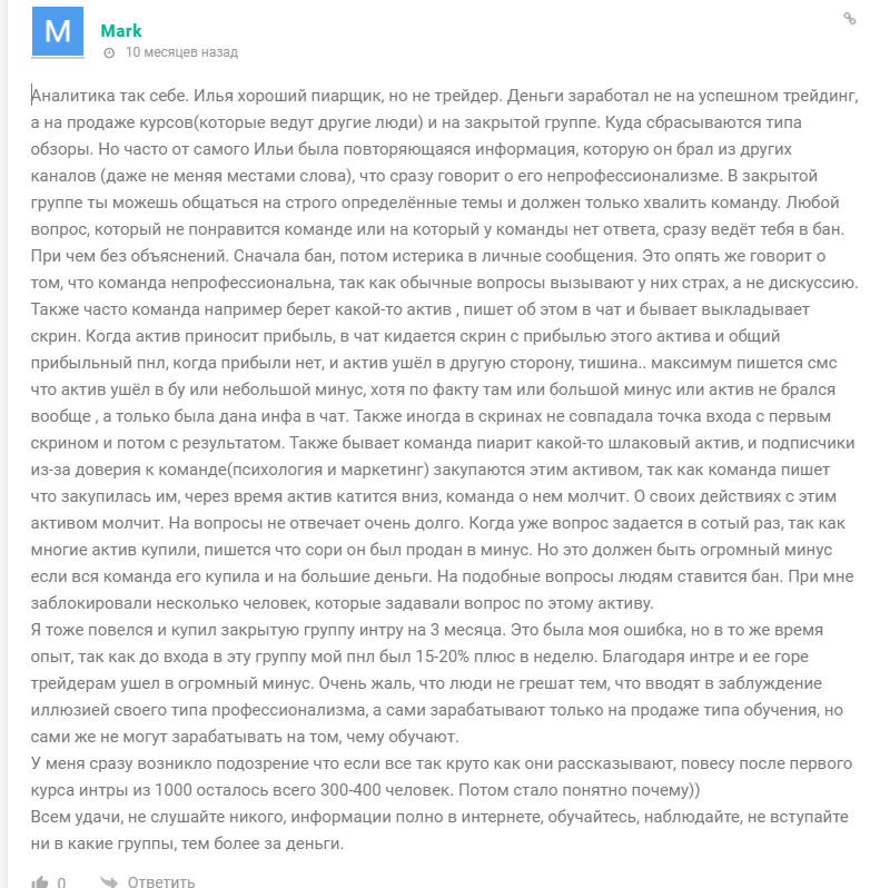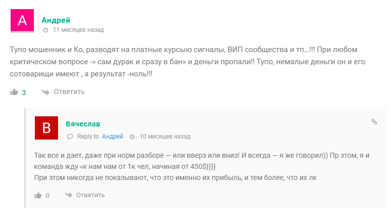 На независимых ресурсах и форумах отзывы преимущественно отрицательные. Пользователи сообщают о сливе депозитов при следовании сигналам, низком качестве аналитики и отсутствии подтвержденной статистики.