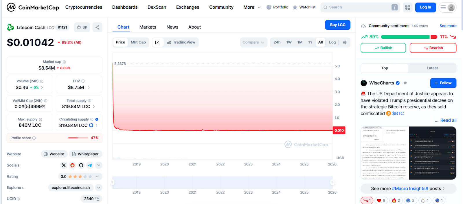 Главный вопрос здесь даже не в железе, а в самой модели доходности. Расчеты CryptoCalc показывают прибыль почти исключительно на LitecoinCash — нишевой монете с небольшой капитализацией 8.7 миллионов долларов. Это означает, что теоретически можно намайнить огромное количество монет, но продать их по указанной цене это совсем другой вопрос.