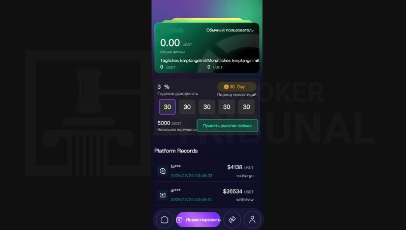 Регистрация в системе требует обязательного реферального кода, но где его брать – непонятно. После успешного входа в систему потребуется только внести депозит, который возможен только в USDT. Система обещает мгновенное пополнение баланса.