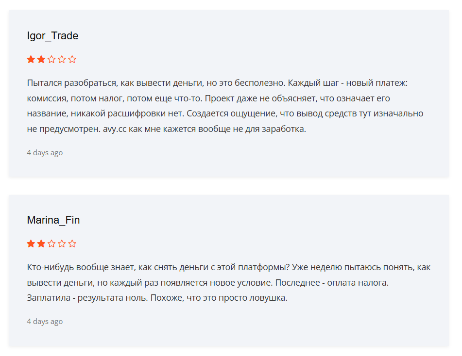 Отзывы об Avy cc публикуются в интернете достаточно часто, но все носят негативный характер. Пользователи сообщают, что при попытке вывести прибыль сталкиваются с бесконечными требованиями системы оплатить очередную комиссию, налог и пр. Даже после выполнения всех условий клиенты остаются в убытках, в связи с чем и настоятельно не рекомендуют регистрироваться на сайте.