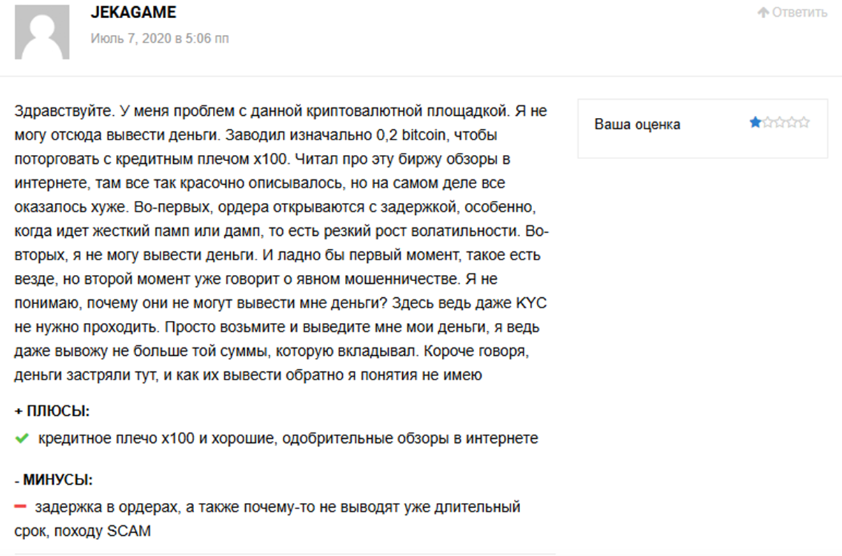 Некоторые отмечают сложности с выводом средств, сбои при открытии ордеров, особенно во время пампа и дампа. Многие предостерегают от использования данной платформы и прямо называют ее скамом.