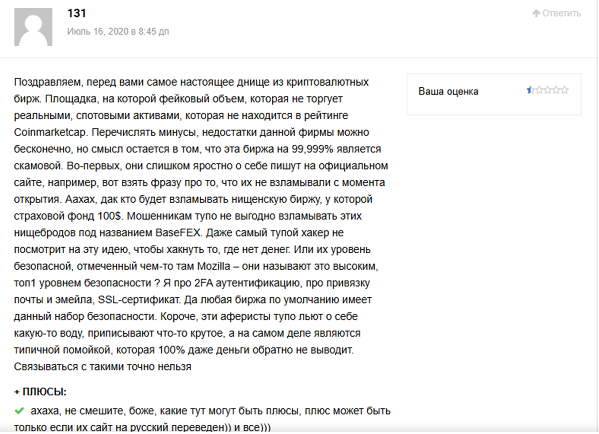 Отзывы на Basefex противоречивые, но отрицательных мнений на независимых форумах все же больше. В положительных откликах трейдеры отмечают удобство использования платформы, широкий ассортимент активов и низкие комиссии.