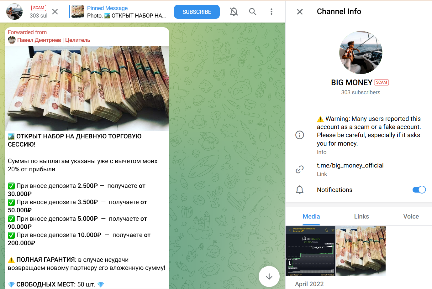 Однако, метку «СКАМ» канал получил даже не за это. В какой-то момент направление деятельности проекта сменилось, и в канале стали предлагать еще одну мошенническую услугу – раскрутку депозита. Причем автор также представлялся Максимом, но уже предлагал пользователям внести небольшую сумму и получить через сутки в несколько раз больше. После получения метки даже был создан второй канал – big money honey. В нем публиковался идентичный контент. Вероятно, таким образом автор пытался избежать негативных комментариев и блокировок.