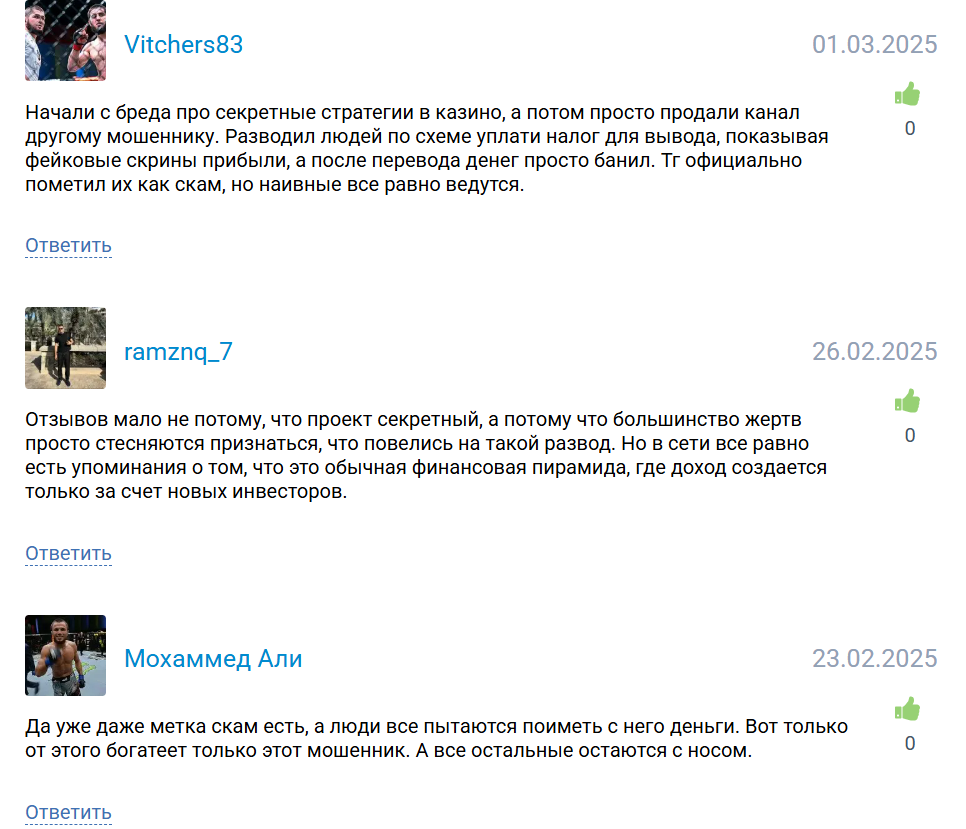 О телеграм-канале Big money отзывы в сети только негативные. Пользователи открыто пишут, что проект мошеннический. Все, кто попробовал вложить деньги в казино или разгон депозита, потеряли все до копейки. Ни казино, ни трейдер ничего не выплачивали. Очевидно, что сообщество создано мошенниками. Жулики долго не искали, а взяли самые простые и распространенные схемы обмана.