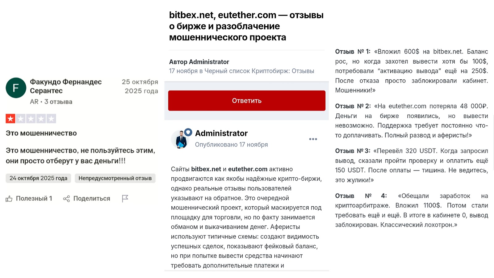 Bitbex работает через клонированный сайт, и в реальности проект создан в 2025 году, а не в 2022, как это пишут создатели. Пользователи не смогли вывести средства из биржи и столкнулись с требованиями совершать дополнительные платежи. Из главного о платформе: