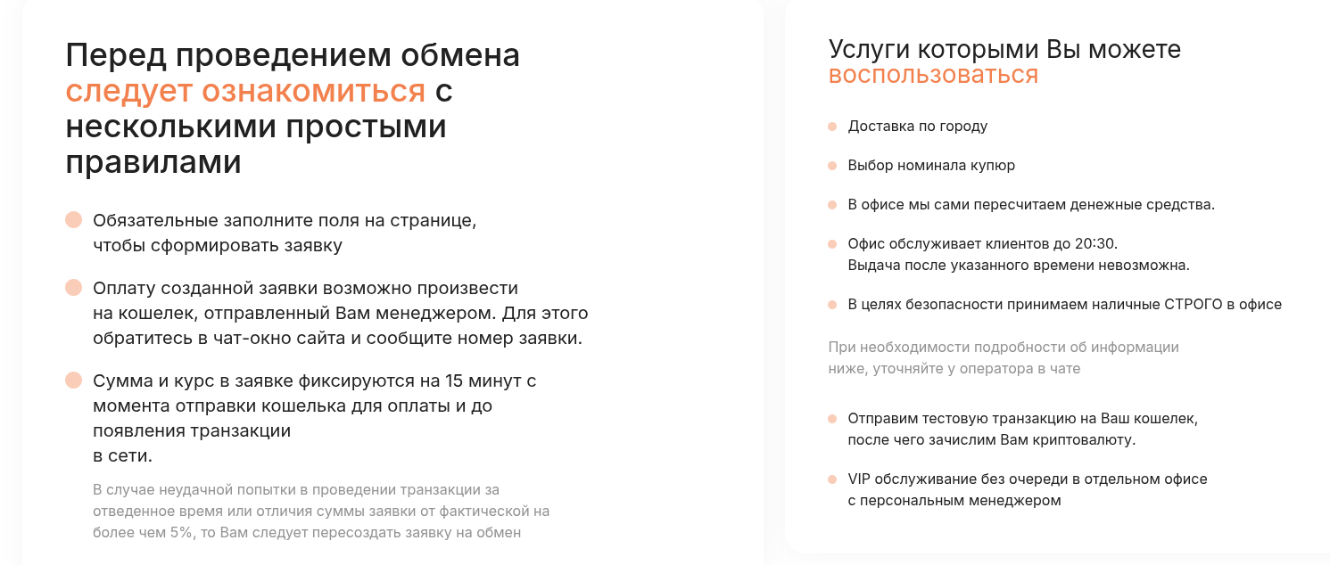 Обменник «БитОкк» – якобы универсальная площадка для безопасных и быстрых сделок с криптой (хотя в чем ее универсальность, непонятно). На сайте они пишут про 700 направлений обмена, обещают «ответ за минуту» и сугубо моментальные зачисления. Из инструментов – онлайн-форма, ТГ-чат техподдержки и покупка/продажа монет за наличные в офисе. В общем, все стандартно и ничего примечательного, поэтому давайте сразу перейдем к минусам и рискам.