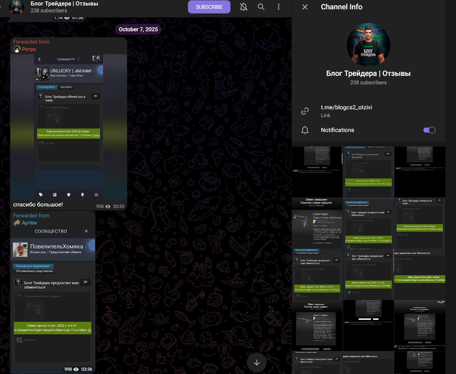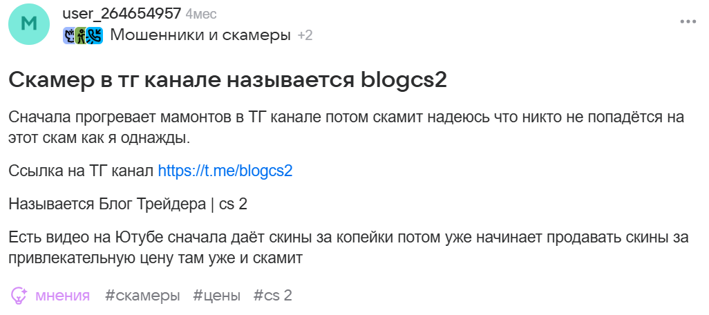 В сети мнения подписчиков о проекте BlogCS2 негативные. Пострадавшие пишут, что копеечные скины трейдер переводит исправно, затем предлагает сделки на большие суммы, где и кидает пользователей на деньги.