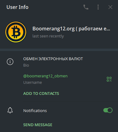 - контакт «Boomerang12 org работаем ежедневно» в мессенджере Telegram;