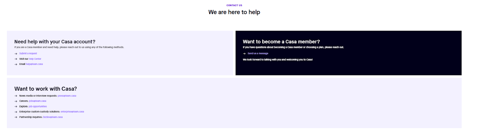 Контактные данные Casa включают несколько каналов для связи. Основной способ обратиться за поддержкой – форма отправки запроса через. Пользователи могут описать проблему и получить ответ от консультанта. Компания подчеркивает, что поддержка доступна всего в одно сообщение. Для членов компании доступна поддержка по электронной почте на адрес help@team casa. Почта предназначена специально для вопросов по аккаунтам и техническим проблемам. Для прессы используется – press@teamcasa.