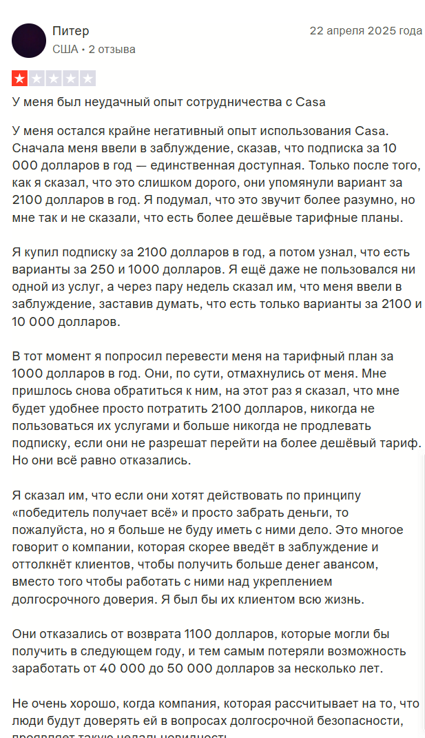 Негативные отзывы о Casa io встречаются в различных источниках. Один из пользователей описал сервис как ненужный. Он указал, что компания фокусируется на получении дохода от подписки, что создает ложное ощущение безопасности. Аналогичные функции можно реализовать самостоятельно без дополнительных затрат.