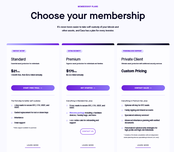 Услуги Casa включают предоставление инструментов для самостоятельного хранения цифровых активов с использованием многофакторной подписи ключей. Компания предлагает три уровня членства, каждый из которых ориентирован на разные объемы хранимых средств. При этом все они зависят от подписки и предполагают регулярные платежи.