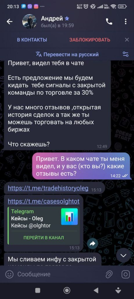 Кейсы Oleg — Телеграмм канал с отчетами о торговых сессиях с клиентами. Автор предлагает сигналы для самостоятельных сделок, а потом просит перевести ему процент от сделки.