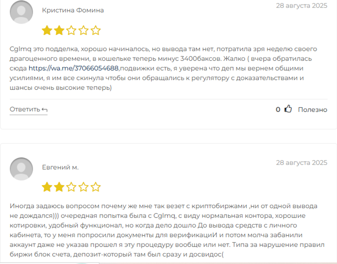 На Cglmq com отзывов в сети довольно много, несмотря на то, что платформа работает короткий срок. Но все отзывы на форумах негативные.