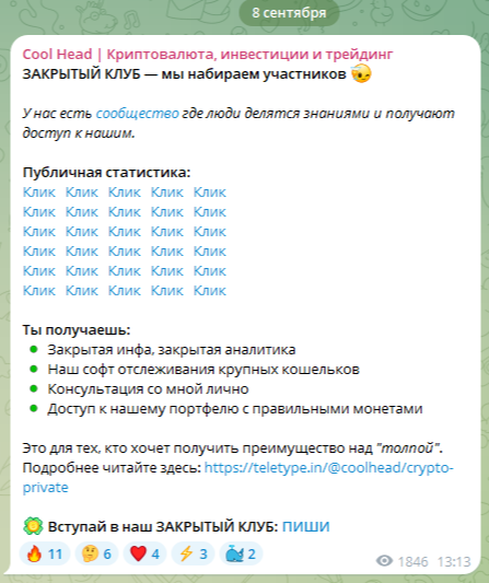 Основная деятельность трейдерского проекта заключается в привлечении целевой аудитории в закрытый клуб автора. В этом комьюнити трейдер Head Ch учит подписчиков выгодно покупать и продавать цифровые активы, предоставляет софт для отслеживания крупного капитала, аналитику и цели по активам. Для привлечения новых клиентов в закрытую группу на основном канале «Cool Head Криптовалюта, инвестиции и трейдинг» автор размещает достаточно интересный контент: