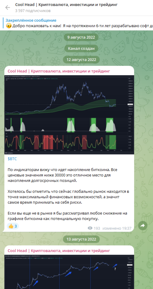 Телеграм-канал «Cool Head Криптовалюта, инвестиции и трейдинг» был основан 9 августа 2022 года. На момент проверки проект о трейдинге имеет 3 597 подписчиков. Публикации автора интересны 60% подписчиков. Данный факт говорит о большом интересе к контенту и живой аудитории.
