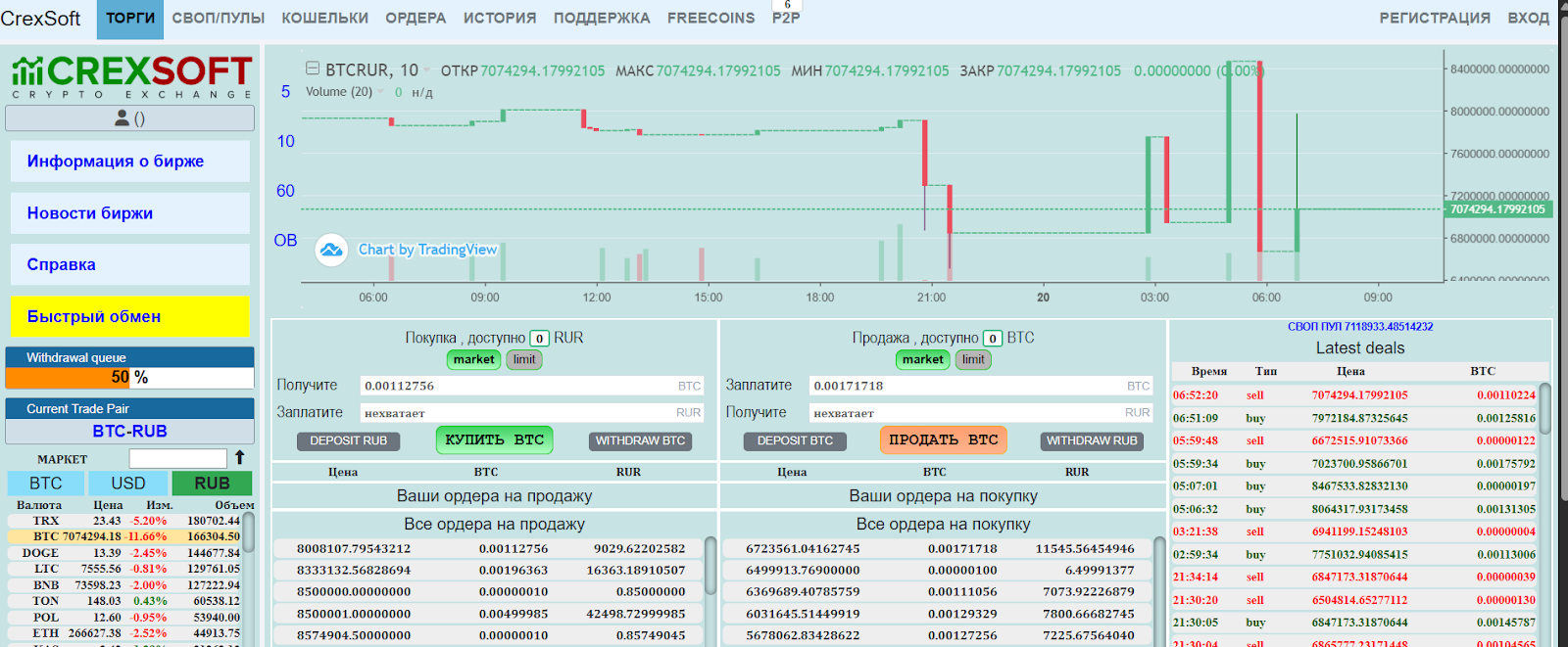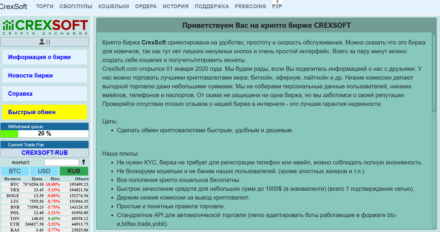 Crexsoft — довольно старая, но не самая надежная криптовалютная биржа. Из плюсов можно отметить торговлю без верификации, не нужно даже предоставлять номер телефона и адрес электронной почты. Низкие комиссии и лояльность к крипте высокого риска.