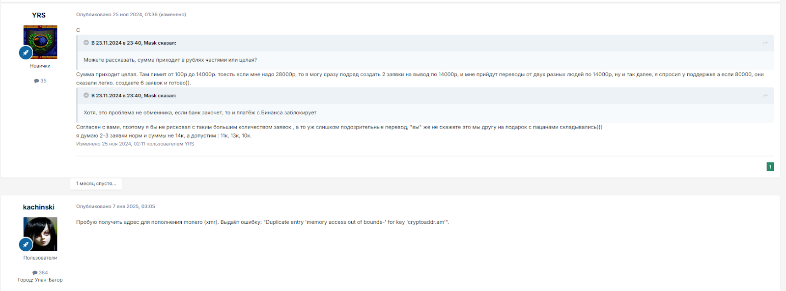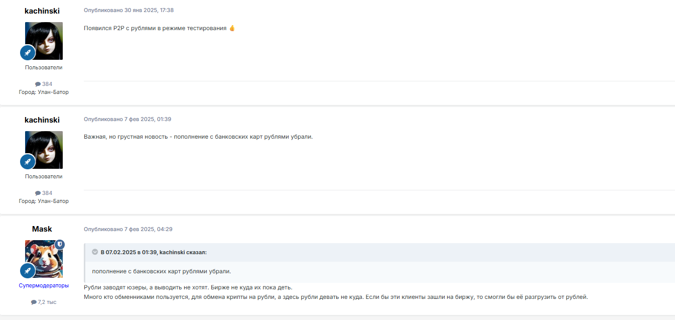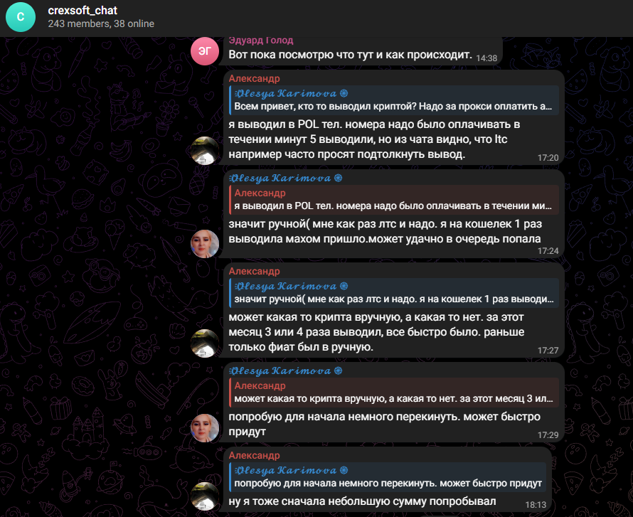 Из социальных сетей у проекта есть только Crexsoft chat, в котором около 250 человек. Сообщения интегрируются с чатом биржи. Если пользователь напишет в ТГ чате, текст мгновенно отобразиться на платформе, и наоборот. Пополнение счета возможно с банковских карт, криптовалютных переводов и платежных систем. Судя по комментариям трейдеров, наибольшей популярностью пользуются анонимные варианты, например, Payeer. На банковские карты установлен лимит — не более 14 000 рублей одним переводом, деньги поступают с карт третьих лиц. Компания допускает использование средств, не прошедших AML проверку, что делает площадку привлекательной для мошенников, это особый риск, который нужно учитывать при выводе крипты.