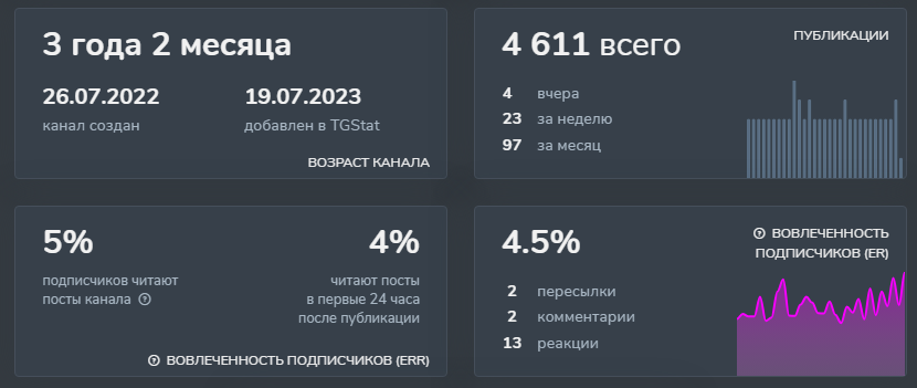 Сам паблик закрытый и доступ к контенту возможен только по пригласительной ссылке. Страница зарегистрирована в 2022 году, на октябрь 2025 года на паблик подписались почти 9 тыс. человек. Проверка через сервис TGStat показала низкую вовлеченность аудитории — каждый пост набирает не больше 500 просмотров.