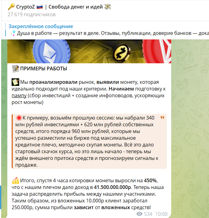 Внутри CryptoZ подогревают уверенность еще и рассказами о том, как это происходит. Приводят пример прошлой сессии: якобы собрали 340 млн рублей от участников, добавили 620 млн собственных средств, итого 960 млн; все зашло на биржу под максимальное плечо, выбранная монета выросла на 450%, а с плечом это “дало 41,5 млрд рублей прибыли”, которую затем распределили между участниками.