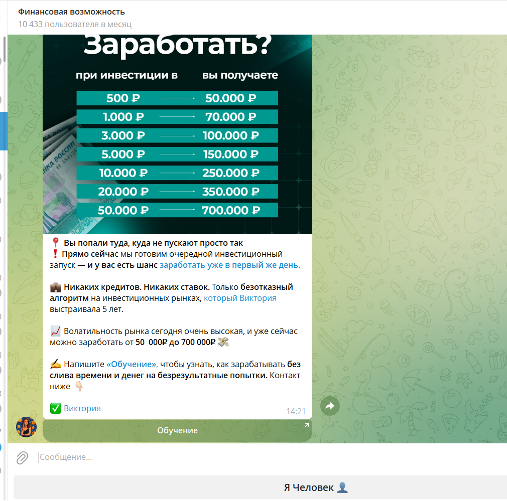 Кнопка ведет к переписке с наставником и дальше в привязанный канал “Финансовая возможность”, где уже больше десяти тысяч пользователей за месяц и прямая таблица во сколько раз вырастет депозит: 500 рублей превращаются в 5К, тысяча в 70К и 50 тысяч в 700К. По логике авторов, все работает на заранее подготовленном алгоритме, который некий аноним “Виктория строила пять лет”.