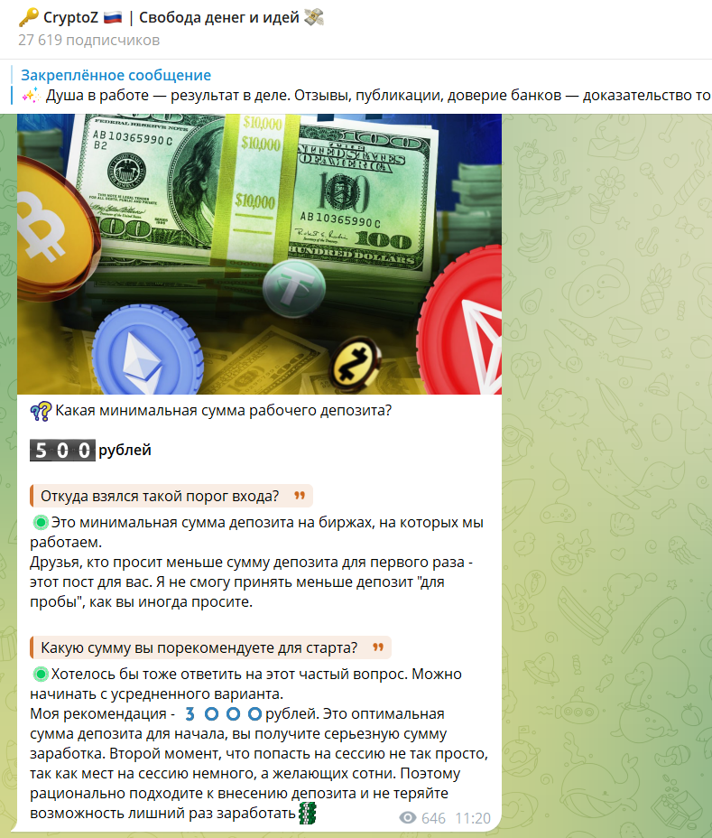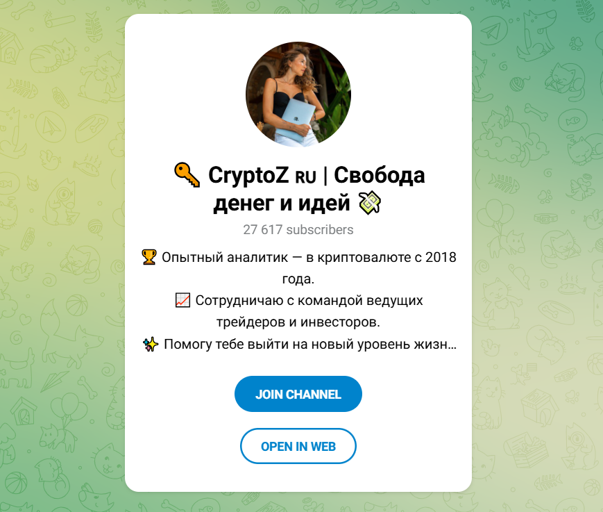 Канал “CryptoZ Свобода Денег и Идей” выглядит как комьюнити про крипту: опытный аналитик с 2018 года, команда трейдеров и инвесторов, обещание помочь выйти на новый уровень жизни и дохода.