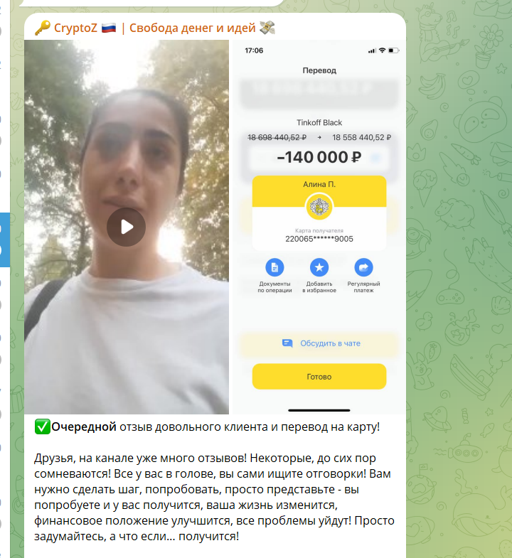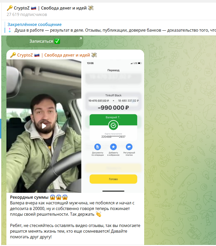 Внутри самого канала “CryptoZ Свобода Денег и Идей” обратная связь подается постами самого автора: благодарности, рекордные суммы, истории про то, как кто-то не побоялся и внес 20К, а теперь пожинает плоды, призывы записывать видео-отзывы, заверения в честности и пустом черном списке.