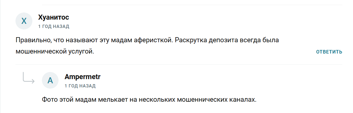 В независимых источниках картина другая. Люди прямо называют раскрутку депозита мошеннической услугой и отмечают, что лицо ведущей встречается сразу в нескольких схемах, которые меняют названия каналов, но сохраняют фотографии, подачу и сценарии.