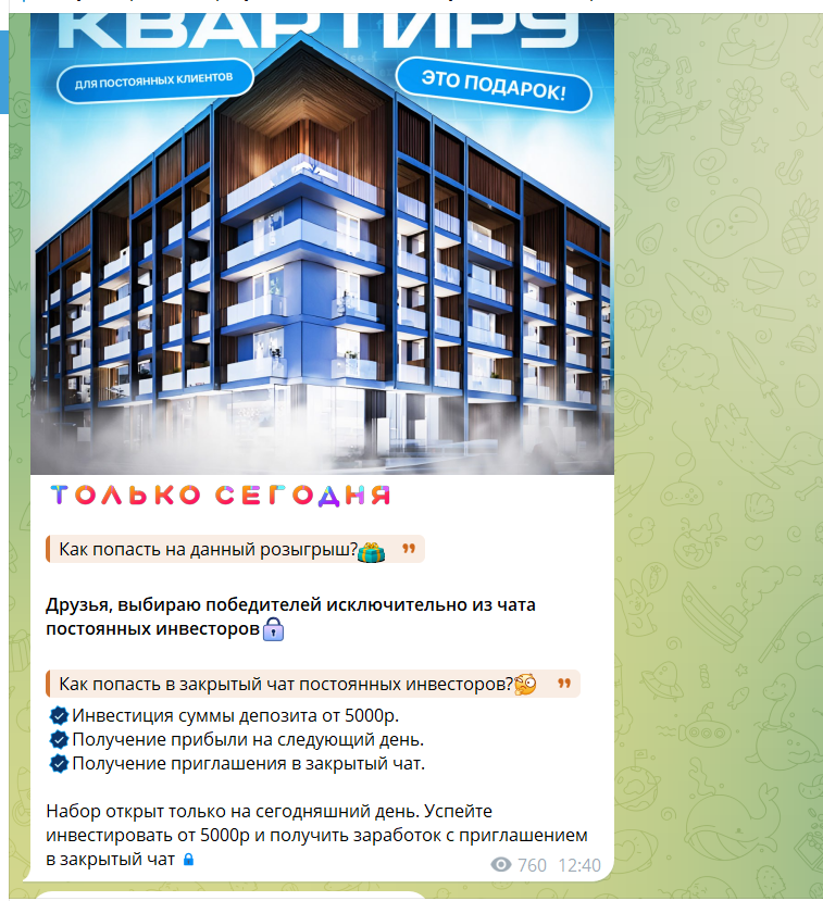 В соседних постах отвечают на популярные вопросы. Минимальный депозит 500 рублей, но для старта оптимально внести 3 тысячи. Чтобы попасть в закрытый чат постоянных инвесторов, просят внести от 5К рублей, а на следующий день обещают прибыль и приглашение в приват. Для постоянных обещают даже розыгрыши квартир.