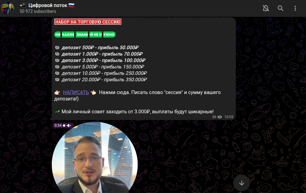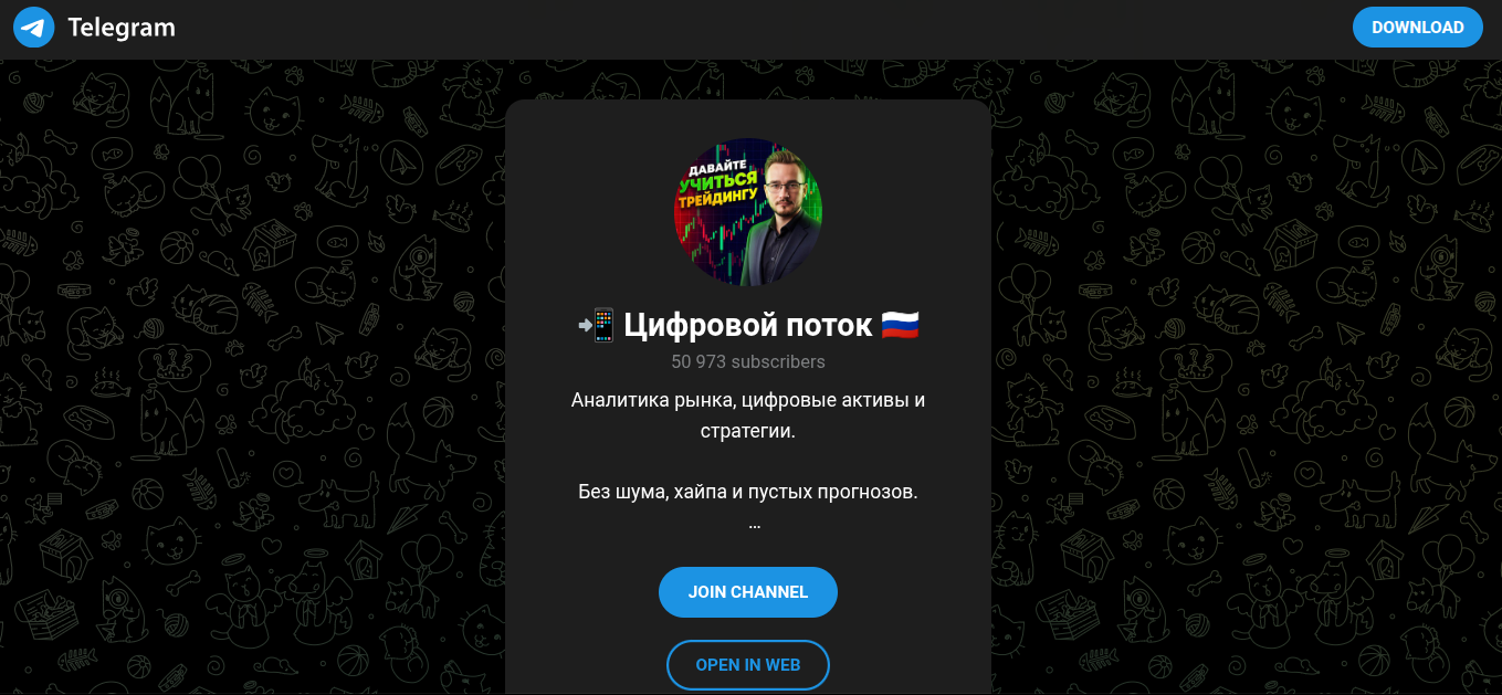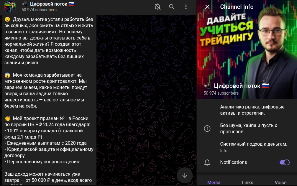 В описании сообщества эксперт утверждает, что на ТГ-канале пользователи получают готовую аналитику рынка, детали по цифровым активами. К тому же, владелец телеграмм-канала «Цифровой Поток» якобы публикует инсайдерские стратегии и практикует системы подход к деньгам.