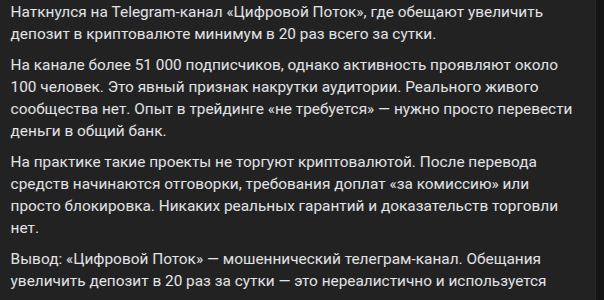 Для наших читателей мы сделали свыше 1000 разборов телеграмм-каналов по типу проекта «Цифровой Поток», которые не помогают увеличить доход. Если не хотите работать с мошенниками, то обязательно читайте наши статьи.