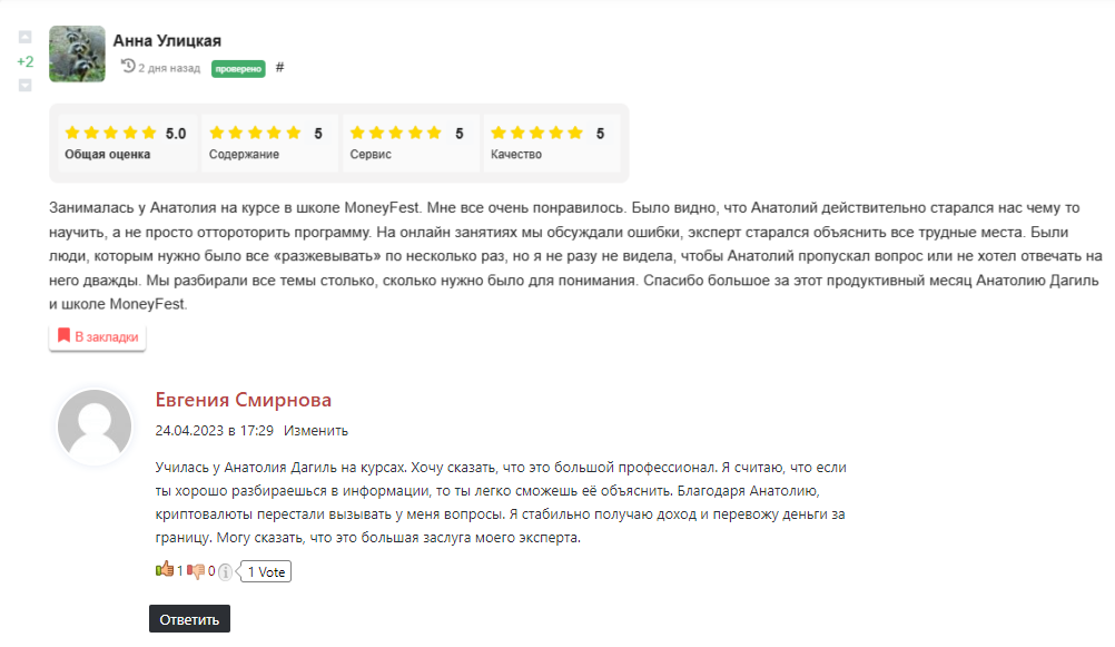 Отзывы о работе Анатолия Дагиля и его школе MoneyFest