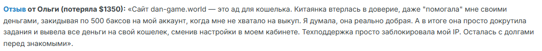 На январь 2026 года отзывы на сервис негативные. Например, некая Ольга потеряла здесь $1,350. Из ее отзыва понятно, что представители сервиса самостоятельно находят новых клиентов и выходят с ними на связь, предлагая заработать. Первое время менеджеры активно помогают на площадке, уверяя, что все честно и легально. Тем не менее отзывы о Dan Game world подтверждают, что все-таки площадка занимается разводом и оставляет в убытке.