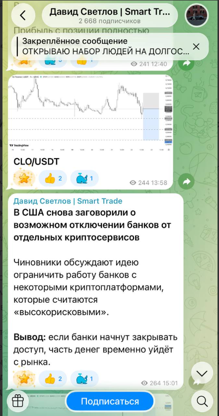 Контент типовой для трейд‑каналов. Публикуют сигналы с ценой входа, целями и стопом, выкладывают графики и короткий теханализ. Но публичного трек‑записи сделок нет: не видно, как считали результат, какой был риск на сделку, какой просадкой все это сопровождалось. Плюс комментарии отключены, спросить и получить разбор по конкретной сделке негде. В «закрытую» группу зовут через личку david svetlovtr.