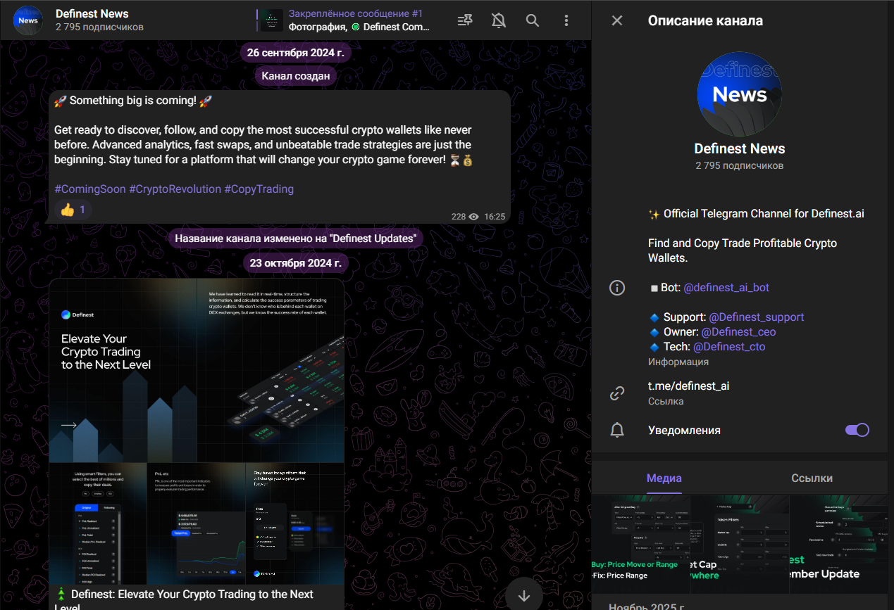 Платформа Definest ai позиционируется одним из лучших алгоритмов для копирования сделок на децентрализованных биржах. Чтобы зарегистрироваться в системе, необходимо активировать бота в Телеграмм. Он в свою очередь потребует подписаться на три телеграмм-канала. Один из них освещает главные новости сервиса, второй чат для обсуждения и третий рекламирует крипто-кошелек экосистемы. Весь контент на английском.