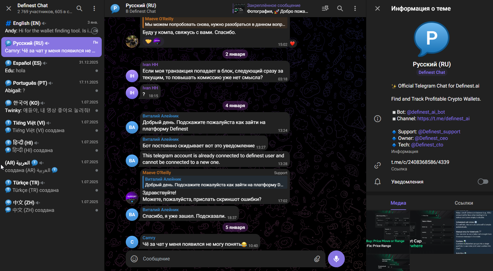 На январь 2026 года на телеграмм-канал подписано почти 3 000 человек, но охваты не превышают 1 000, что указывает на вероятную накрутку аудитории. Комментировать посты пользователи не могут, но для обсуждений и предусмотрен отдельный чат.В чате есть несколько веток – по языкам, включая русский. Судя по сообщениям, пользователи Definest ai часто сталкиваются с техническими проблемами – то не получается авторизоваться, то бот выдает ошибку, то транзакции попадают в блок.