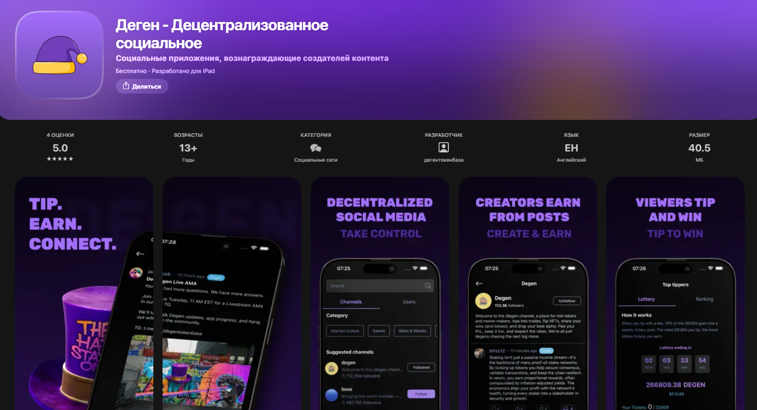 Децентрализованная социальная медиа-платформа для управления запасами Degen Token доступна и в мобильной версии, но скачать приложение можно только на смартфоны с ОС iOS.